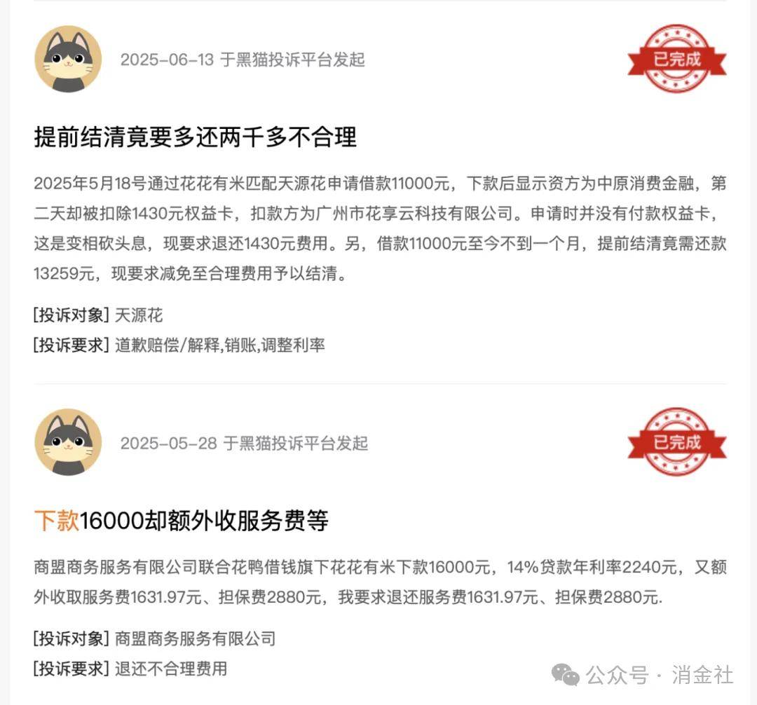 投诉编号 17384027167 显示「2025年5月18号通过花花有米匹配天源花申请借款11000元,下款后显示资方为中原消费金融,第二天却被扣除1430元权益卡,扣款方为广州市花享云科技有限公司。」