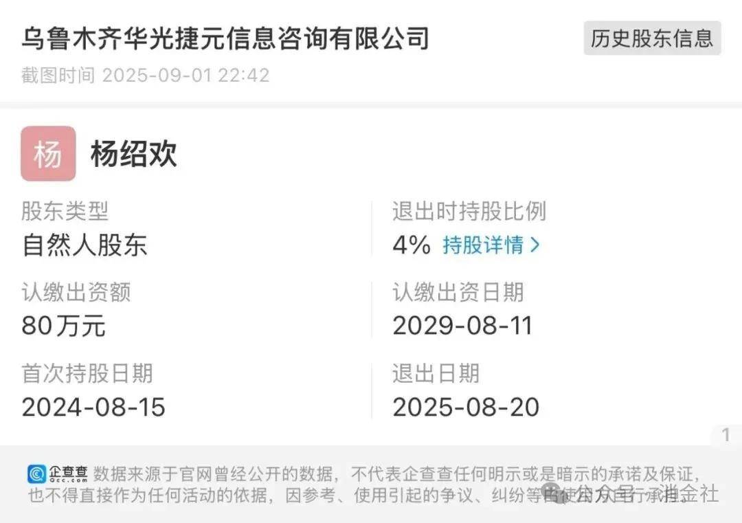企查查显示,叶丽宇(广西企云网络技术有限公司法人)名下有5家公司,包括贵阳市云岩区广弘小额贷款有限公司、乌鲁木齐华光捷元信息咨询有限公司等。其中,乌鲁木齐华光捷元信息咨询有限公司的历史股东中包括一名叫杨绍欢的自然人,而杨绍欢这个名字与“广西云腾”和“杭州云驱智汇”股东名字一致。