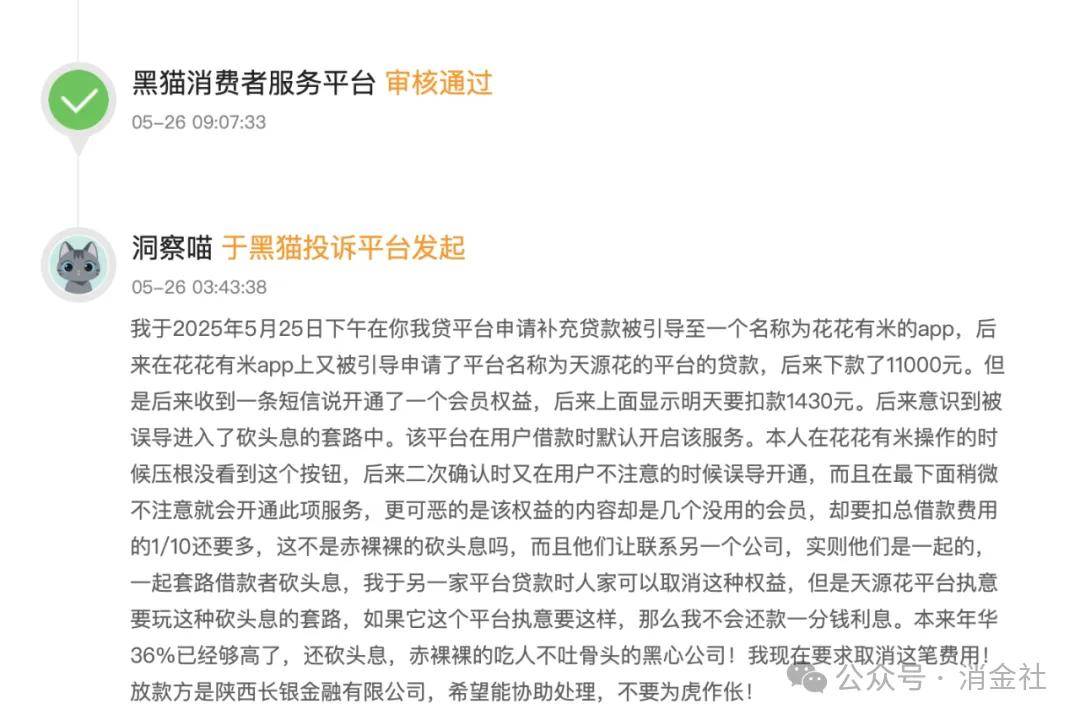 投诉编号 17383359605 显示「2025年5月25日下午在你我贷平台申请补充贷款被引导至一个名称为花花有米的app,后来在花花有米app上又被引导申请了平台名称为天源花的平台的贷款,后来下款了11000元。但是后来收到一条短信说开通了一个会员权益,后来上面显示明天要扣款1430元。……放款方是陕西长银金融有限公司」