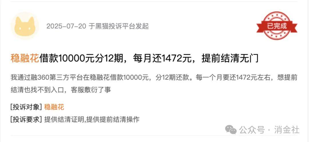 另有用户投诉显示:「在稳融花借款10000元,分12期还款。每一个月要还1472元左右,想提前结清也找不到入口。」