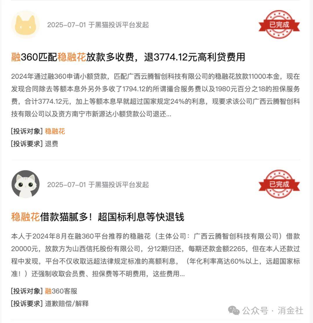 《助贷新规》落地仅剩不足1个月,然而近日,消金社注意到,在黑猫投诉上,有不少用户投诉显示:“花花有米”、“稳融花”存在高额“撮合服务费”/“担保费咨询费”、爆通讯录、隐匿/模糊合同相关信息等情况,致使借款产品的年化利率超过36%,部分投诉案例显示用户承担的实际借款年化甚至高达105%。