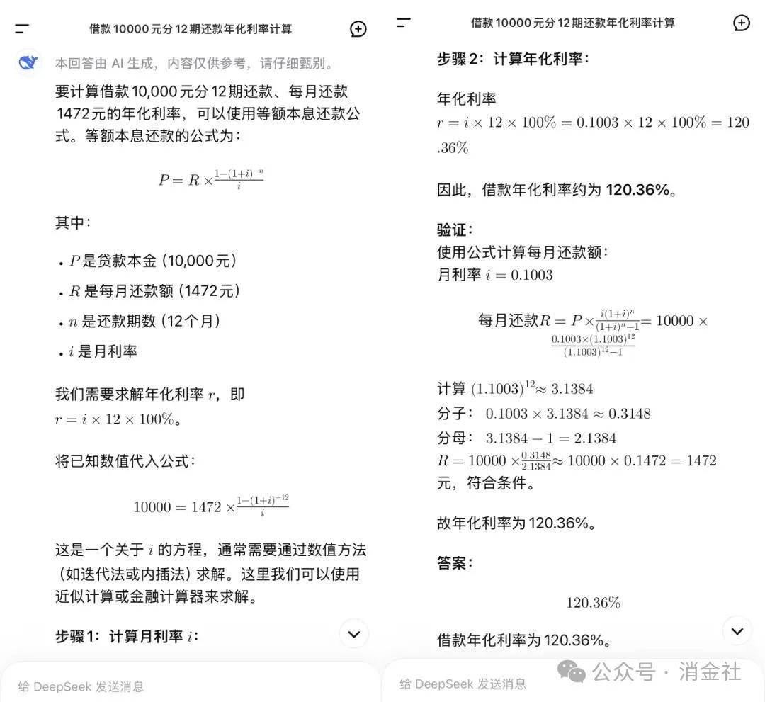 若以借款总额为10000元,分12期,每期还款1472元计算,DeepSeek计算出该笔借款的年化利率为120.36%。