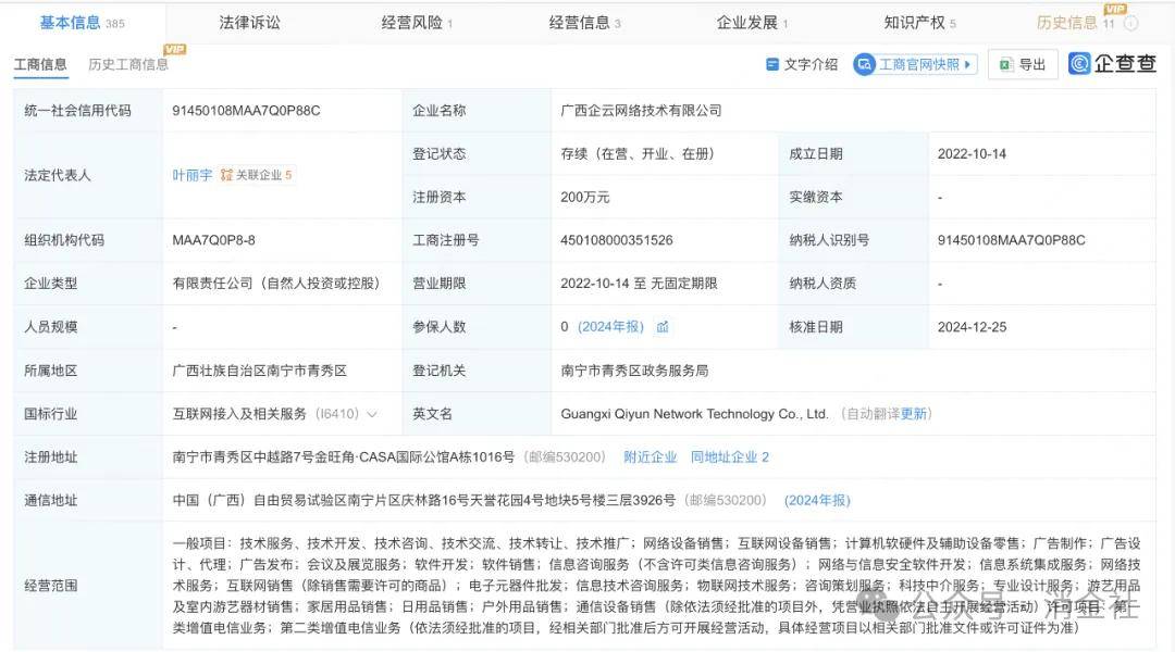 企查查显示:广西企云网络技术有限公司「经营异常」。2025年8月27日,该公司被南宁市青秀区市场监督管理局列入「经营异常」,原因是「通过登记的住所或者经营场所无法联系」。该公司法人为叶丽宇,实际控制人为王回银,公司实缴资本为0,参保人数为0。