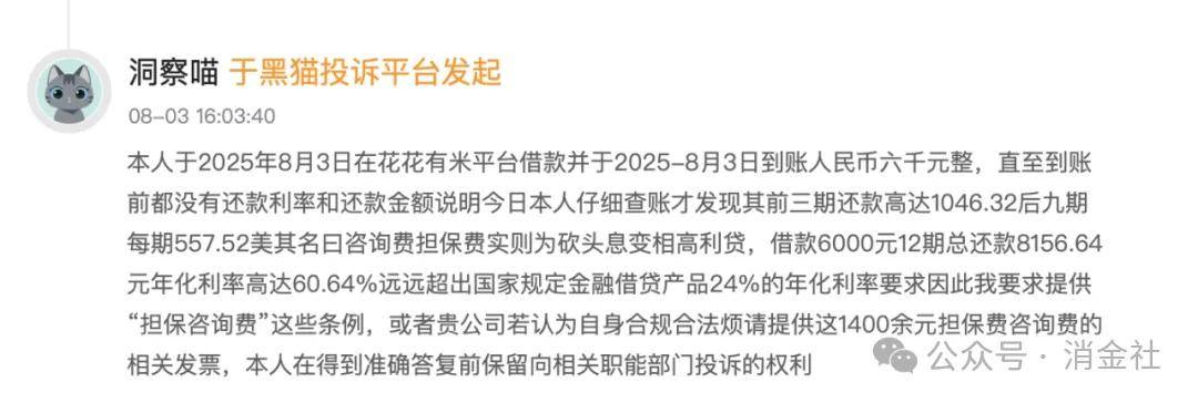 投诉编号 17385932575 显示「在花花有米平台借款并于2025年8月3日到账人民币六千元整,发现其前三期还款高达1046.32后九期每期557.52美其名曰咨询费担保费,借款6000元12期总还款8156.64元年化利率高达60.64%,烦请提供这1400余元“担保费咨询费”的相关发票。」