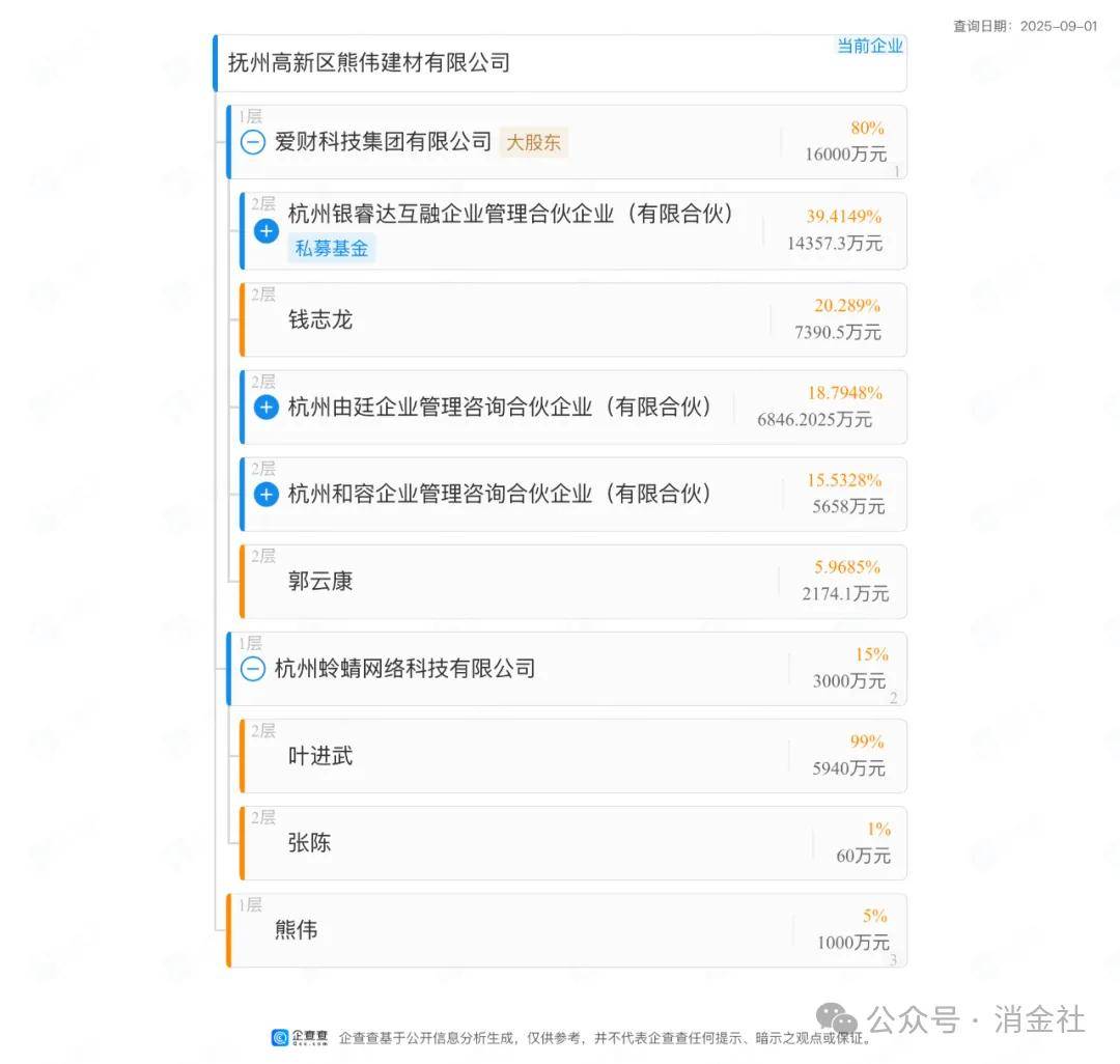 “公开信息显示,盈盈理财对外投资一家名为抚州爱盈普惠网络小额贷款有限公司;该公司大股东为爱财科技,占股50%,盈盈理财占股45%,熊伟占股5%。爱财科技法人代表为钱志龙,旗下有消费分期商城爱又米等借贷平台。”