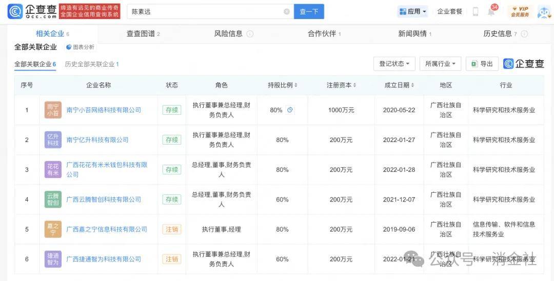 “广西云腾”实控人陈素远名下共有6家关联公司,包括南宁小苔网络科技有限公司、广西花花有米米钱包科技有限公司、南宁亿升科技有限公司等。