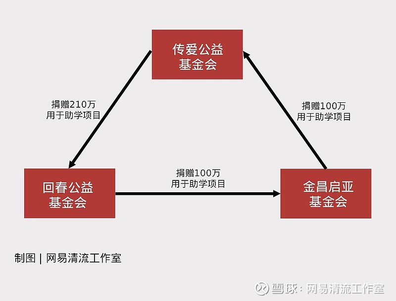 2023年,传爱公益基金会向回春公益基金会捐赠210万,用途为“助学项目”;同年,回春公益基金会向金昌启亚基金会捐赠了100万,也是用于“助学”;巧合的是,在同年收到100万助学善款后,金昌启亚基金会又向传爱公益基金会捐赠了100万,同样也用于“助学项目”。