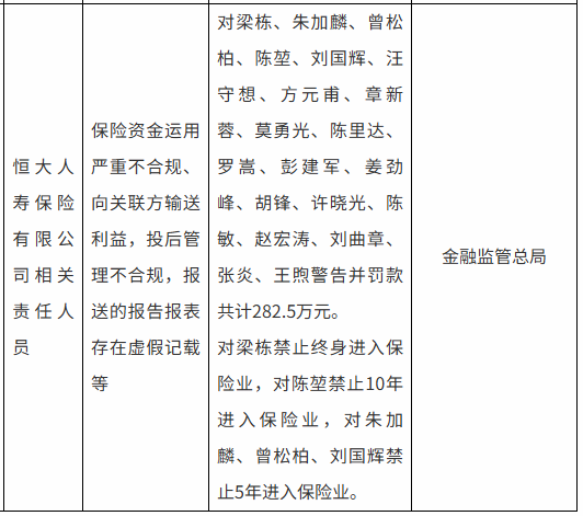 恒大人寿多位责任人因“保险资金运用严重不合规、向关联方输送利益,投后管理不合规,报送的报告报表存在虚假记载等”问题被处罚,20名相关人员合计被罚款282.5万元。