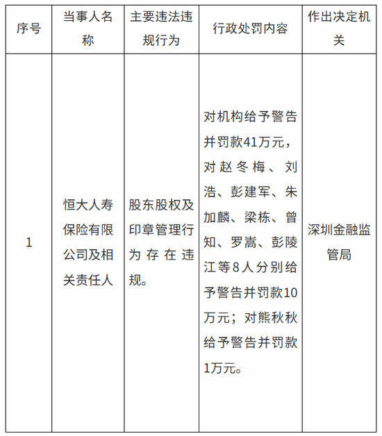深圳金融监管局也公布了对恒大人寿及相关责任人的罚单,因“股东股权及印章管理行为存在违规”,恒大人寿被警告并罚款41万元,相关责任人员同步被给予警告以及罚款的处罚。