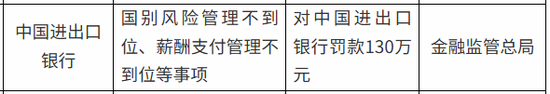 进出口银行是本轮罚单中唯一一家政策性银行。据金融监管总局罚单,进出口银行因国别风险管理不到位、薪酬支付管理不到位等事项被罚130万元。