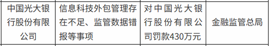 光大银行因信息科技外包管理存在不足、监管数据错报等事项被罚款430万元。