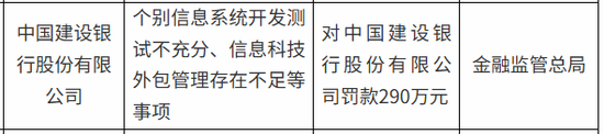 建设银行因个别信息系统开发测试不充分、信息科技外包管理存在不足等事项被罚290万元。