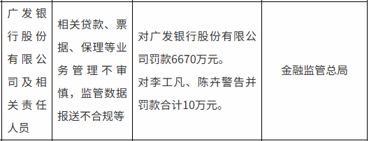 广发银行因相关贷款、票据、保理等业务管理不审慎,以及监管数据报送不合规等问题被处以6670万元罚款,相关责任人李工凡、陈卉被警告并合计罚款10万元。