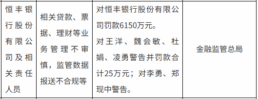 恒丰银行因相关贷款、票据、理财等业务管理不审慎,监管数据报送不合规等被罚款6150万元。相关责任人王洋、魏会敏、杜娟、凌勇被警告并罚款合计25万元;李勇、郑现中被警告。
