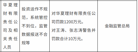 华夏理财因存在投资运作不规范、系统管控不到位、监管数据报送不合规等行为被罚款1200万元,相关责任人王涛、张志涛被警告并合计罚款10万元。