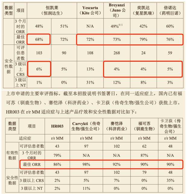 与此同时,恒润达生核心产品的技术先进性也引起市场质疑。从关键数据指标来看,在r/rB-NHL治疗领域,其核心产品HR001的最佳ORR为68%,在5家有数据的竞品中排名最末,其余4家的ORR均超过72%;同时,HR001的3级及以上CRS为6%,这一数值高于另外三家竞品(该指标数值越低表明安全性更优)。而在r/rMM治疗领域,另一核心产品HR003的最佳ORR为86%,同样在同类竞品中处于垫底位置——其他4家竞品的ORR均高于90%。综合来看,恒润达生的核心产品在疗效与安全性指标上均未展现出明显竞争优势。