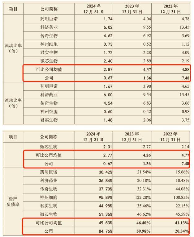与众多处于亏损状态的创新药企相同,恒润达生除了尚无产品上市外,巨额研发支出是造成公司累计未弥补亏损规模较大的首要原因。2022年至2024年,公司研发费用分别达到2.42亿元、2.56亿元和1.52亿元。与此同时,公司持续推进研发投入,业务运营也消耗了大量资金。2022至2024年,恒润达生经营活动产生的现金流量净额分别为-2.09亿元、-2.26亿元、-1.41亿元。受此影响,公司货币资金及交易性金融资产等流动资产规模大幅缩减,截至2024年末,可使用的货币资金仅为7151.43万元。财务指标方面,公司流动比率及速动比率呈下降趋势,偿债能力明显不足。其中,资产负债率在2022年至2024年大幅攀升,分别为20.34%、59.98%、84.76%,除2022年外,该指标均远高于可比公司的平均水平。