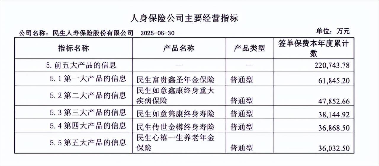 民生人寿在今年二季度偿付能力报告中披露了上半年签单保费前五的产品。 作者在中国保险行业协会数据库中查询发现,前四款产品均于2023年9月前停售,这或意味着今年上半年保费规模主要依靠停售产品的续期保费。第五款产品民生心禧一生养老年金保险亦于2025年8月31日停售。投资收益方面,今年上半年末,投资收益率、综合投资收益率分别为1.78%、1.8%;民生人寿这两项指标近三年平均数据分别为3.12%、3.74%。