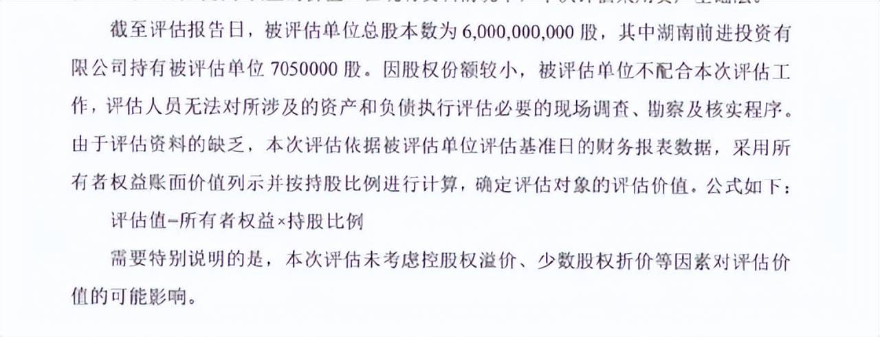 该份资产评估报告亦指出,被评估单位(即民生人寿)总股本数为60亿股,其中湖南前进持有被评估单位705万股。因股权份额较小,被评估单位不配合本次评估工作,评估人员无法对所涉及的资产和负债执行评估必要的现场调查、勘察及核实程序。由于评估资料的缺乏,本次评估依据被评估单位评估基准日的财务报表数据,采用所有者权益账面价值列示并按持股比例进行计算,确定评估对象的评估价值。