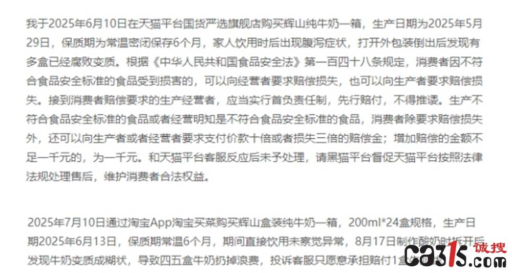 据消费日报报道,该报记者在黑猫投诉、小红书等平台发现,有关辉山产品在保质期内变质的投诉近两年来持续不断。有消费者反映,多盒从网店购买的辉山纯牛奶在保质期内腐败变质;还有消费者称,准备用辉山盒装纯牛奶制作酸奶时,发现保质期内的牛奶已变质成糊状。