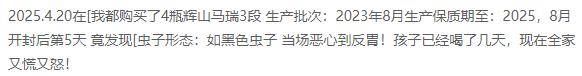 此外,还有多位消费者反映在辉山多款产品中发现虫子、头发等异物。其中,有消费者投诉称,自己在给孩子冲泡辉山奶粉时,发现奶粉中有黑色虫子。“真是当场恶心到反胃,孩子已经喝了几天,现在全家又慌又怒。”