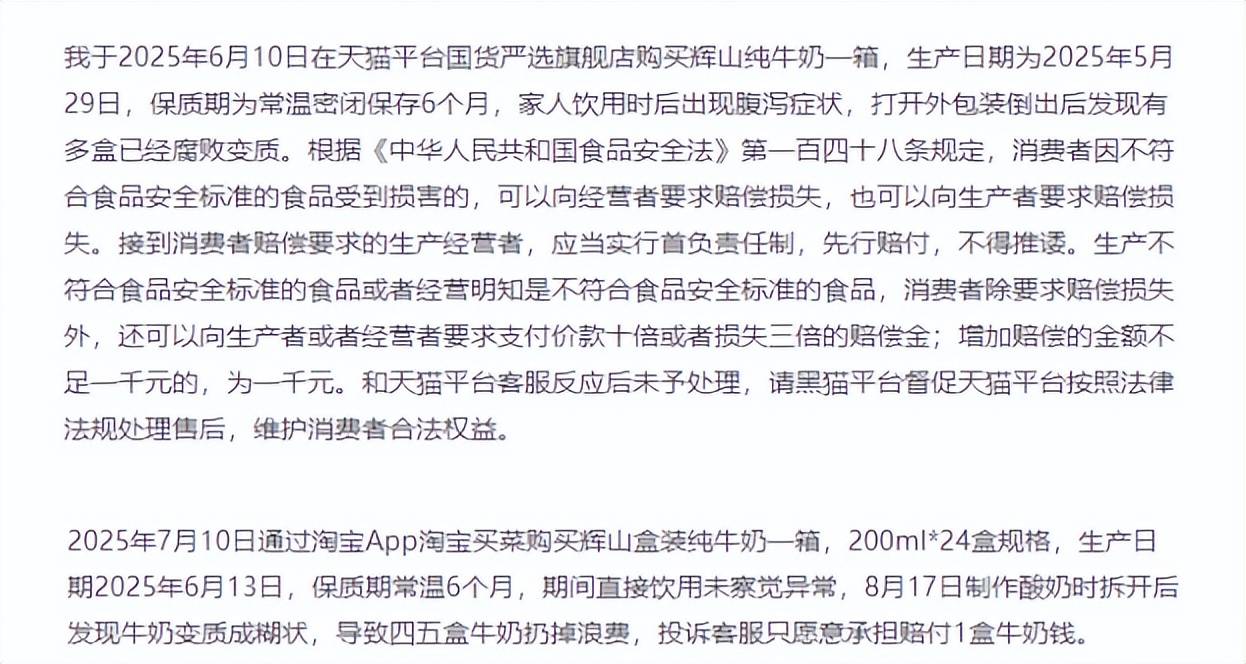 记者在黑猫投诉、小红书等平台上看到,有关辉山产品在保质期内变质的投诉近两年来始终未断。其中,有消费者反映,多盒从网店购买的辉山纯牛奶,在保质期内腐败变质;还有消费者称,自己准备用辉山盒装纯牛奶制作酸奶时,发现保质期内的牛奶已变质成糊状。