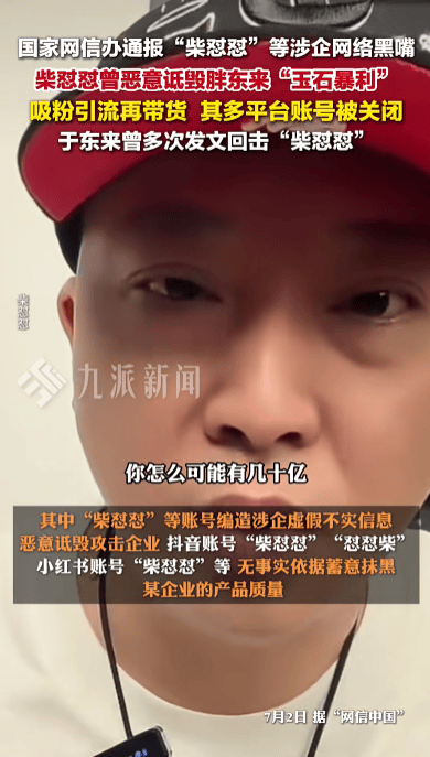 7月2日,网信中国微信公号发文:抖音账号 “柴怼怼”“怼怼柴”,小红书账号 “柴怼怼” 等,无事实依据蓄意抹黑某企业的产品质量,恶意诋毁某企业和企业家形象声誉,并借机吸粉引流带货。涉及的账号已被依法依约关闭。