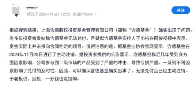 根据雪球去年11月底帖文,已有多位投资者发帖称含德基金无法兑付且疑似含德基金实控人于小彬在网传视频中表示,资金实际上并未投向合同约定的项目。耐人寻味的是,就在去年11月22日,上海含德基金于中基协主动注销。