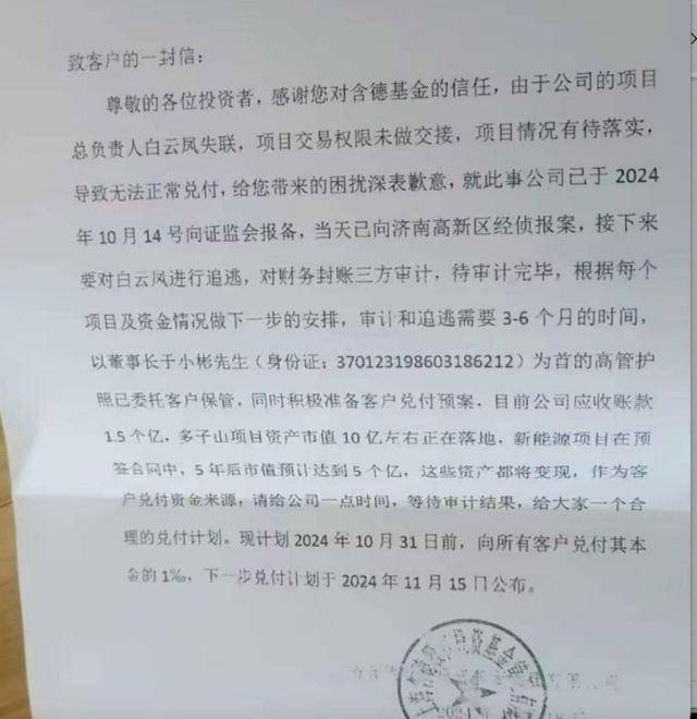 就在去年,雪球帖文披露了上海含德基金致客户的一封信,其中提及公司项目总负责人白云凤失联,未交接项目交易权限,项目情况有待落实,导致无法正常兑付。公司已就此事于2024年10月14日向证监会报备,并向济南高新区经侦报案,后续将追逃白云凤,对财务封账进行三方审计,审计和追逃需要3-6个月的时间。