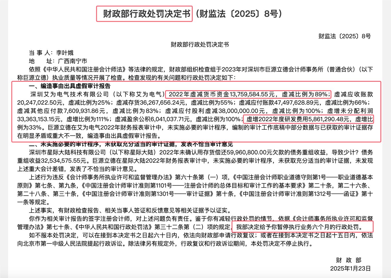 深交所发行审核网站显示,深圳艾为电气技术股份有限公司已受理已问询。然而财政部最近发布的一份财政部行政处罚决定书(财监法〔2025〕8号)却踢爆了一个公司 2022 年曾经显然了数据造假的事实。