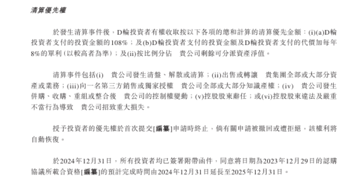 资料显示,D轮投资者有权于发生若干或然事件(包括但不限于未能于2024年12月31日前完成合资格首次公开发售)时要求公司赎回其股份。赎回价为以下较高者:D轮投资者支付的投资金额加上每年8%的单利减任何已付股息;及D轮投资者持有的股份当时的公允价值。
