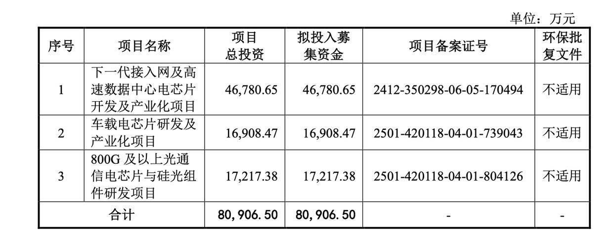 此次IPO,优迅股份拟募集资金约8.09亿元,扣除发行费用后,将用于下一代接入网及高速数据中心电芯片开发及产业化项目、车载电芯片研发及产业化项目、800G及以上光通信电芯片与硅光组件研发项目。