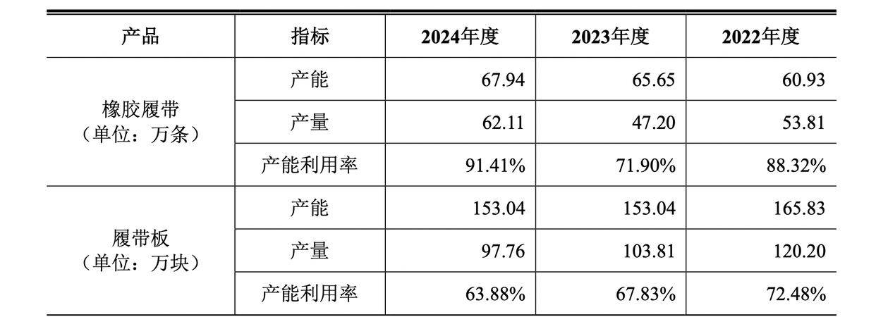 然而,元创股份核心产品履带板的产能利用率并不高。报告期内,公司橡胶履带(农用履带、工程履带合并计算)的产能利用率分别为88.32%、71.90%、91.41%,履带板的产能利用率分别为72.48%、67.83%、63.88%。