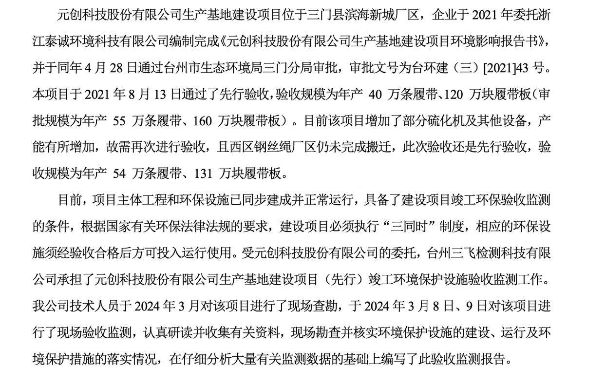 据台州三飞检测科技有限公司编制的《元创科技股份有限公司生产基地建设项目(先行) 竣工环境保护验收监测报告》显示,元创股份的生产基地建设项目于2021年8月13日就已通过了先行验收,验收规模为年产40万条履带、120万块履带板(审批规模为55万条履带、160万块履带板)。