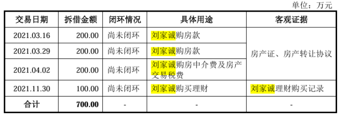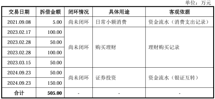 2021年-2024年,刘家诚从其控股公司三星科技陆续拆借资金合计505万元,主要用于购买理财、证券投资和日常消费,尚未形成闭环。