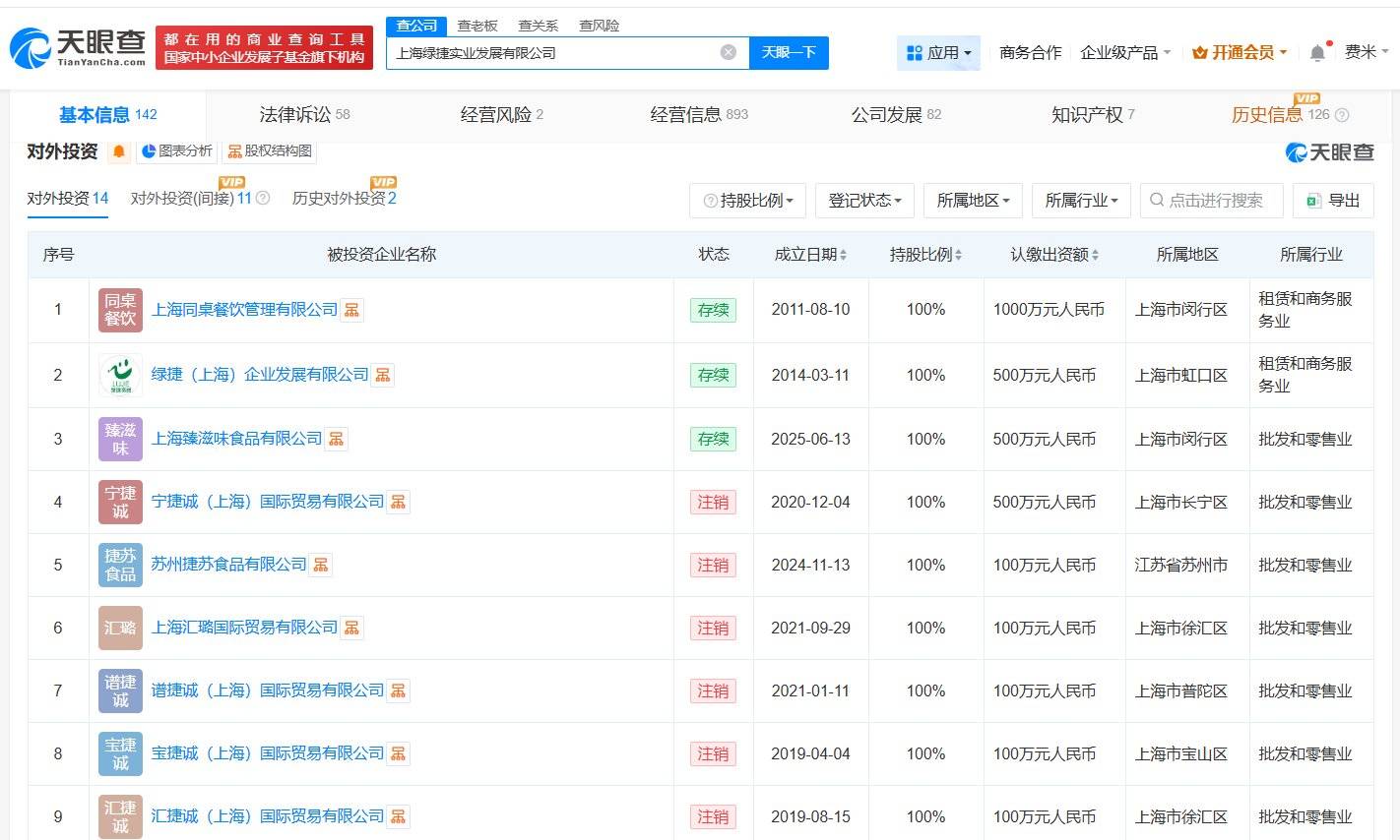 对外投资信息显示,该公司对外投资14家企业,仅有3家企业处于存续状态,分别是上海同桌餐饮管理有限公司、绿捷(上海)企业发展有限公司、上海臻滋味食品有限公司,其余11家企业已注销。天眼风险信息显示,该公司曾多次因生命权、健康权、身体权纠纷被起诉。