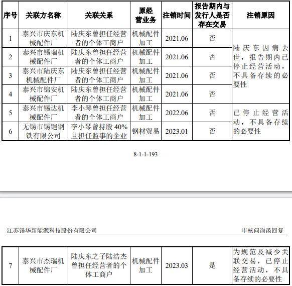 2021年至2023年,锡华科技实际控制人陆某云的兄长陆某东、嫂子李某琴(锡华科技采购部员工)及两人的儿子陆某杰名下,共有7家关联企业先后注销。这7家企业分别是:泰兴市庆东机械配件厂、泰兴市锡瑞机械配件厂、泰兴市陆庆东机械配件厂、泰兴市锦安机械配件厂、泰兴市锡达机械配件厂、无锡市锡铠钢铁有限公司、泰兴市杰瑞机械配件厂。