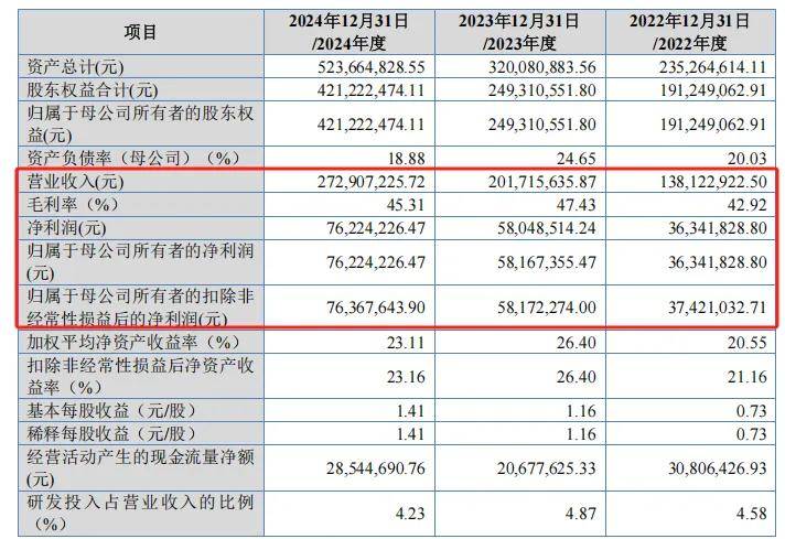 从经营业绩来看,弥富科技近年来表现出稳定的增长态势。2022年至2024年,公司营业收入从1.38亿元增长至2.73亿元,归母净利润从3634.18万元增长至7622.42万元。