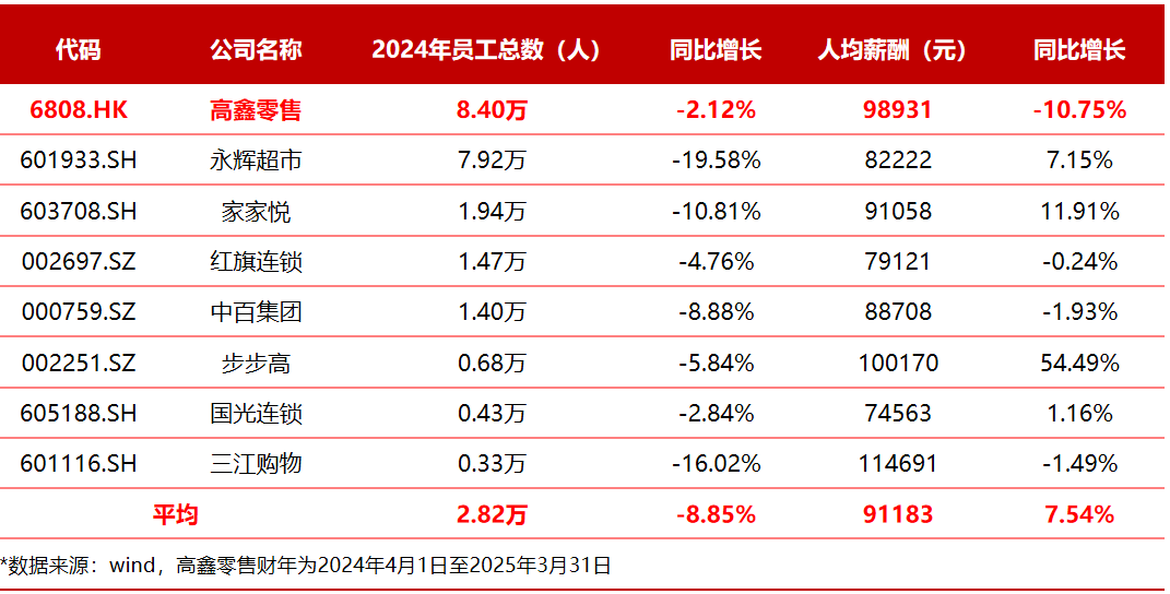 尽管行业整体在“减员”,但人均薪酬基本保持稳定。根据上市商超年报中披露的薪酬支出数据,2024年零售行业平均人均薪酬为91183元,同比增长7.54%。