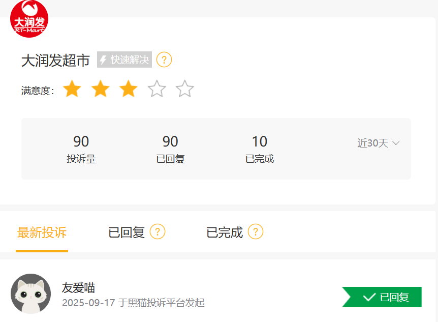 图:大润发在黑猫投诉平台近1个月接到的投诉情况
