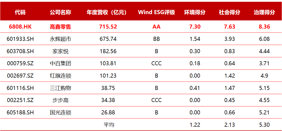 对于外部评价,虽然以MSCI为例的国外评级池并未纳入高鑫零售等国内上市商超,但在国内评级上,以Wind ESG评级为例,高鑫零售则获评AA级,在国内上市商超中大幅度领先。