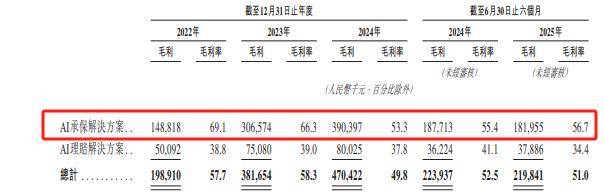 其中,公司收入主要依赖于AI承保解决方案。报告期内,该业务营收占比分别为62.5%、70.6%、77.6%和74.5%,然而其毛利率却呈现出明显的下滑趋势,依次为69.1%、66.3%、53.3%和56.7%。