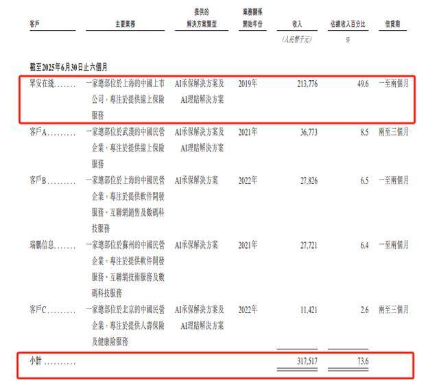 值得一提的是,报告期各期,公司来自众安在线的收入分别为2.71亿元、4.05亿元、4.27亿元及2.14亿元,分别占公司总收入的78.7%、61.8%、45.2%及49.6%。此外,公司来自前五大客户的营收分别占营收的92.3%、82.9%、78.9%及73.6%。
