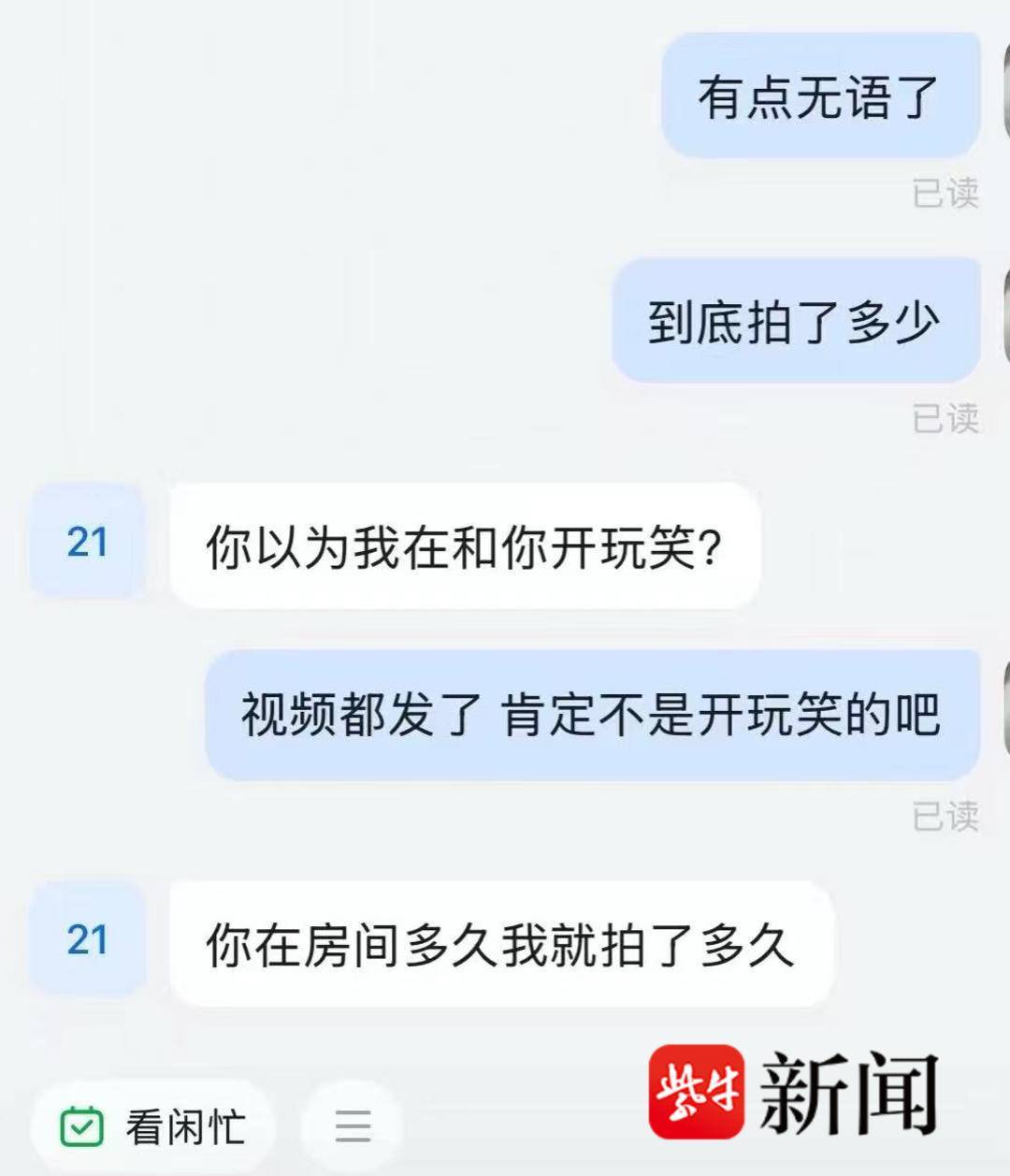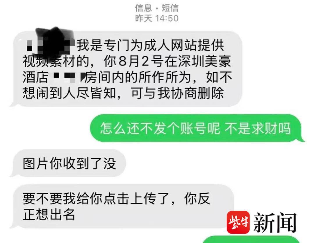 近日,有网友在社交媒体平台发文称,今年8月初,他与女友入住深圳一家美豪酒店,9月,其女友突然收到一条陌生人发来的信息。对方以偷拍视频为威胁,要求其支付3万元“封口费”,否则就将二人的视频上传至成人网站。随后,该网友向涉事酒店所在地派出所报警。