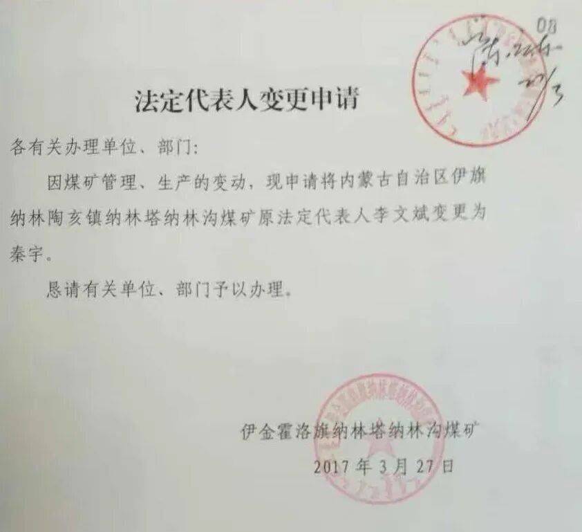2017年3月,秦宇以纳林沟煤矿名义申请变更法定代表人。本文图片均由受访者供图
