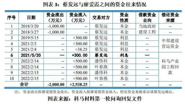 作为中邦建设的实控人,蔡发远还曾于2018年3月向科马材料的实控人廖爱霞借款2000万元。2022年以后,蔡发远由于资金压力较大,未再继续支付借款利息,并于2022年2月通过中邦建设员工叶春燕、潘伟科归还2000万元本金,资金来源同样为科马产业园工程回款。