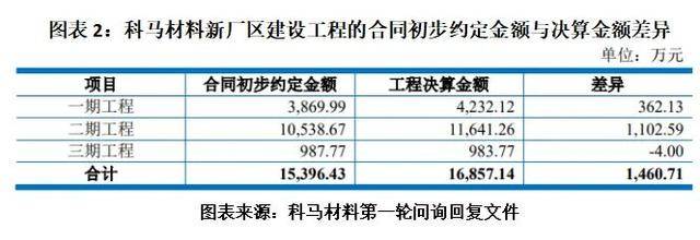 不过,第一轮问询回复文件显示,科马材料新厂区建设工程的合同初步约定金额合计为1.54亿元,而实际决算金额为1.69亿元,比预算金额高1460.71万元。其中,科马材料向中邦建设采购的建筑工程服务金额为1.28亿元,占比约76%。