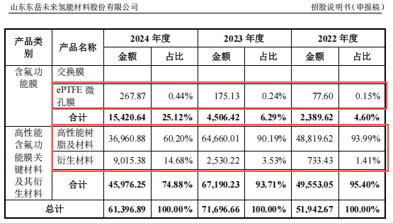 与此同时,公司核心技术产品收入占比呈下降趋势,其中高性能含氟功能膜关键材料及其衍生材料从2022年的95.40%下降至2024年的74.88%。这说明公司可能面临技术迭代压力或市场竞争加剧的风险。