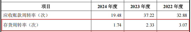 更令人疑惑的是,存货周转率从2022年的2.38次下降至2024年的1.74次,明显低于行业平均水平。