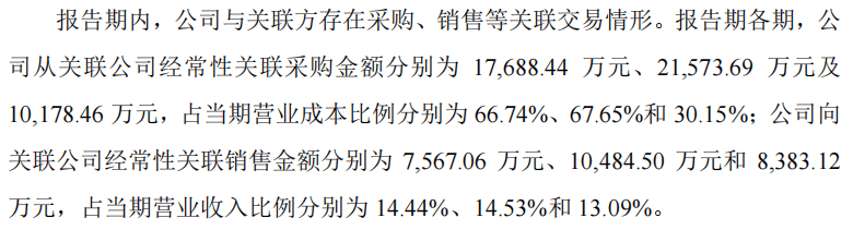 2022-2024年,公司向关联方采购金额分别为1.77亿元、2.16亿元和1.02亿元,占同期营业成本比例分别为66.74%、67.65%和30.15%。同时,公司向关联方销售金额分别为0.76亿元、1.05亿元和0.84亿元。